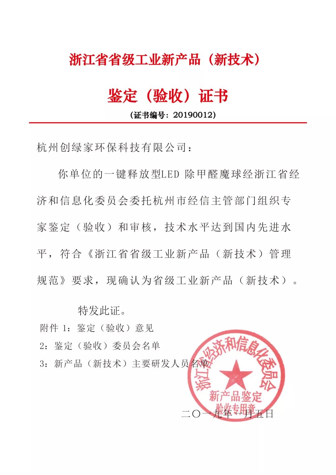 創(chuàng)綠家環(huán)保旗下明星產品搖一搖除甲醛魔球經浙江省經濟和信息化委員會委托杭州市經信主管部門組織專家鑒定(驗收)和審核,技術水平達到國內先進水平,符合《浙江省省級工業(yè)新產品(新技術)管理規(guī)范》要求,現(xiàn)確認為省級工業(yè)新產品(新技術)。